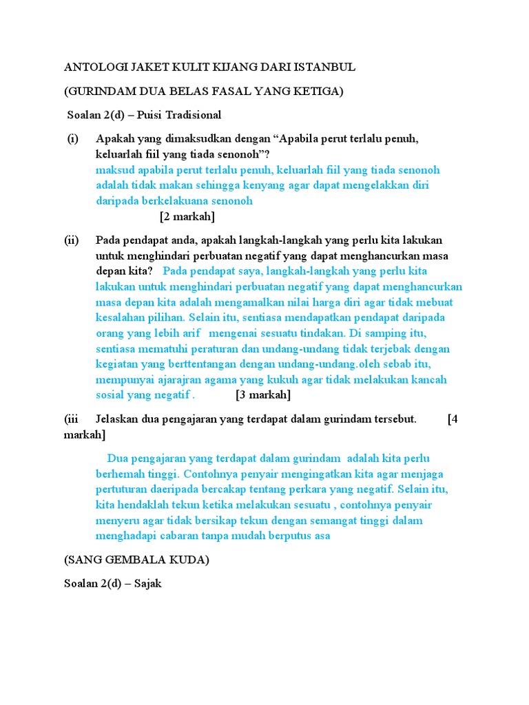 Soalan Dan Jawapan Jaket Kulit Kijang Dari Istanbul Jiran
